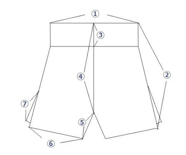 ①ウエスト②総丈③ベルト幅④股上⑤股下⑥裾幅⑦スリット